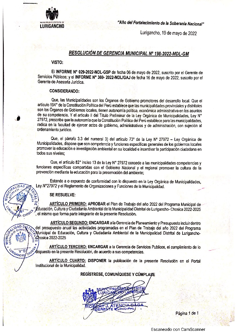 La presente Resolución aprueba el Plan de Trabajo 2022 del Programa Municipal de Educación, Cultura y Ciudadanía Ambiental de la Municipalidad Distrital de Lurigancho (Lima), con la finalidad de definir las actividades de educación, cultura y ciudadanía ambiental que se desarrollarán en la localidad durante el presente año.