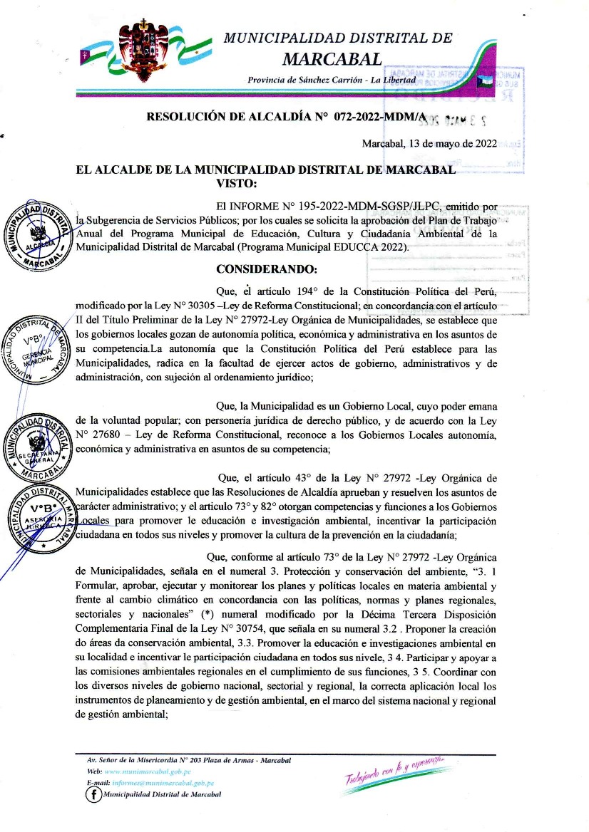 La presente Resolución aprueba el Plan de Trabajo 2022 del Programa Municipal de Educación, Cultura y Ciudadanía Ambiental de la Municipalidad Distrital de Marcabal, con la finalidad de definir las actividades de educación, cultura y ciudadanía ambiental que se desarrollarán en la localidad durante el presente año.
