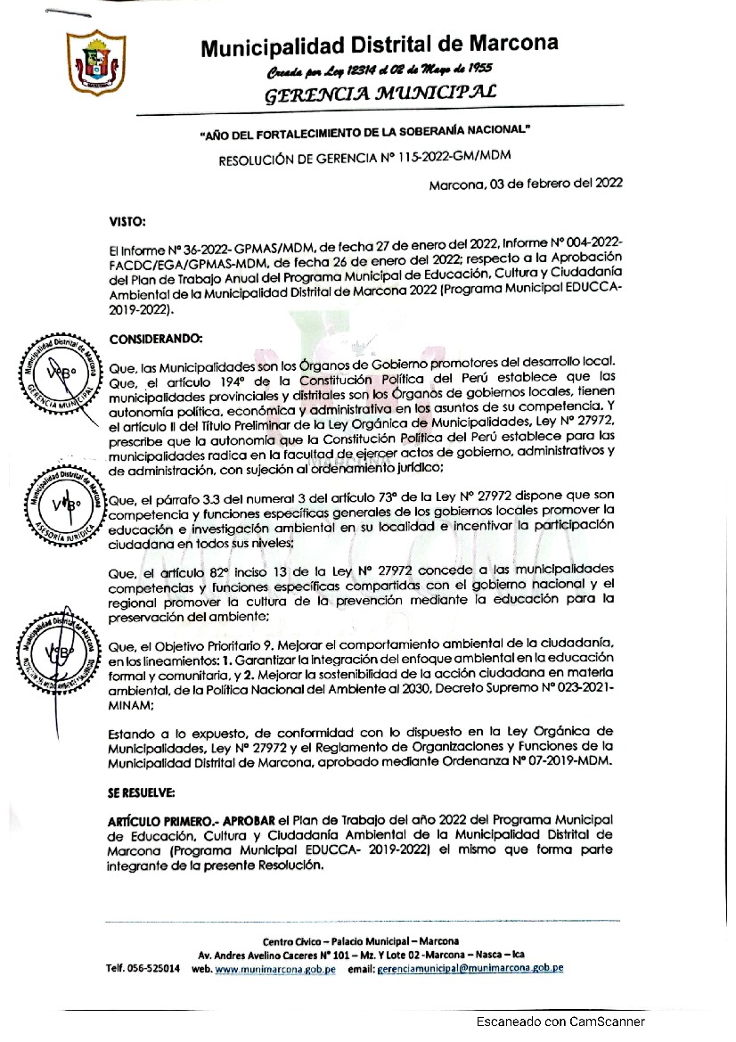 La presente Resolución aprueba el Plan de Trabajo 2022 del Programa Municipal de Educación, Cultura y Ciudadanía Ambiental de la Municipalidad Distrital de Marcona- Nasca, con la finalidad de definir las actividades de educación, cultura y ciudadanía ambiental que se desarrollarán en la localidad durante el presente año.