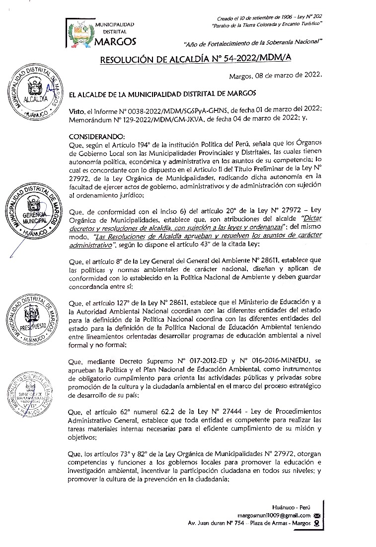 La presente Resolución aprueba el Plan de Trabajo 2022 del Programa Municipal de Educación, Cultura y Ciudadanía Ambiental de la Municipalidad Distrital de Margos, con la finalidad de definir las actividades de educación, cultura y ciudadanía ambiental que se desarrollarán en la localidad durante el presente año.