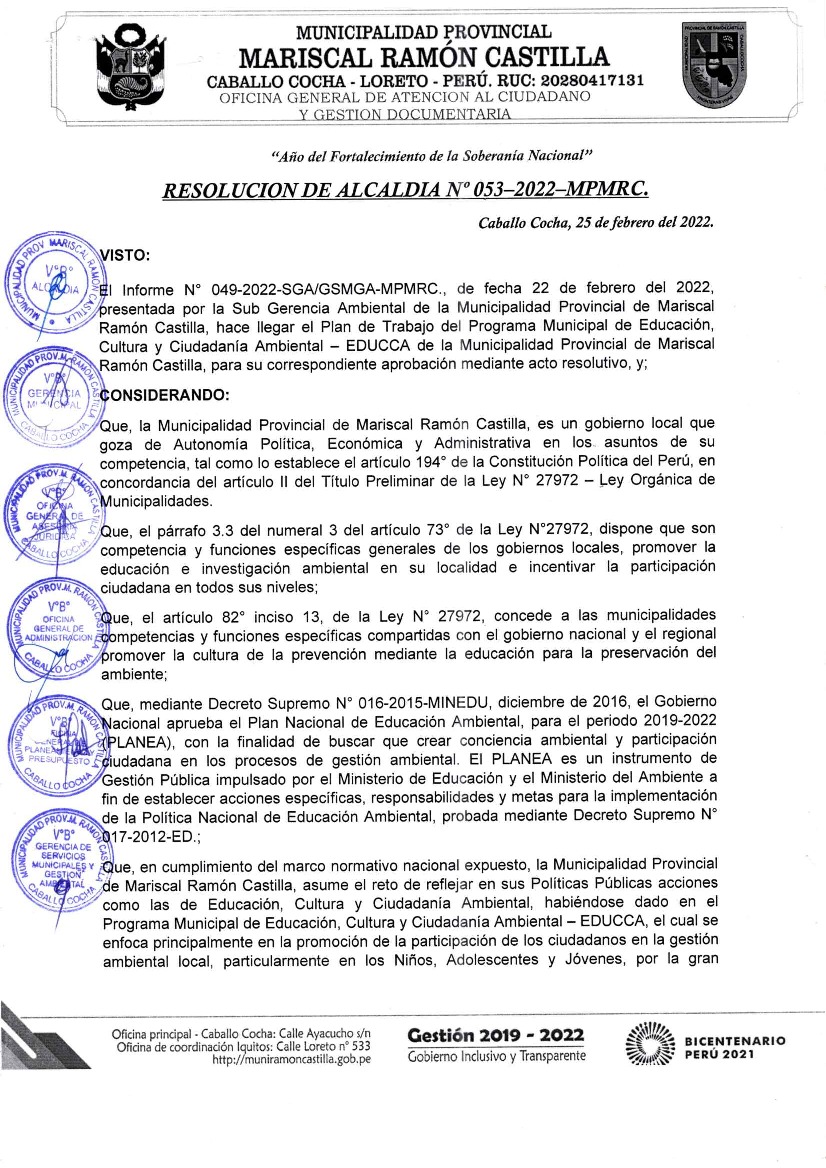 La presente Resolución aprueba el Plan de Trabajo 2022 del Programa Municipal de Educación, Cultura y Ciudadanía Ambiental de la Municipalidad Provincia de Mariscal Ramón Castilla, con la finalidad de definir las actividades de educación, cultura y ciudadanía ambiental que se desarrollarán en la localidad durante el presente año.