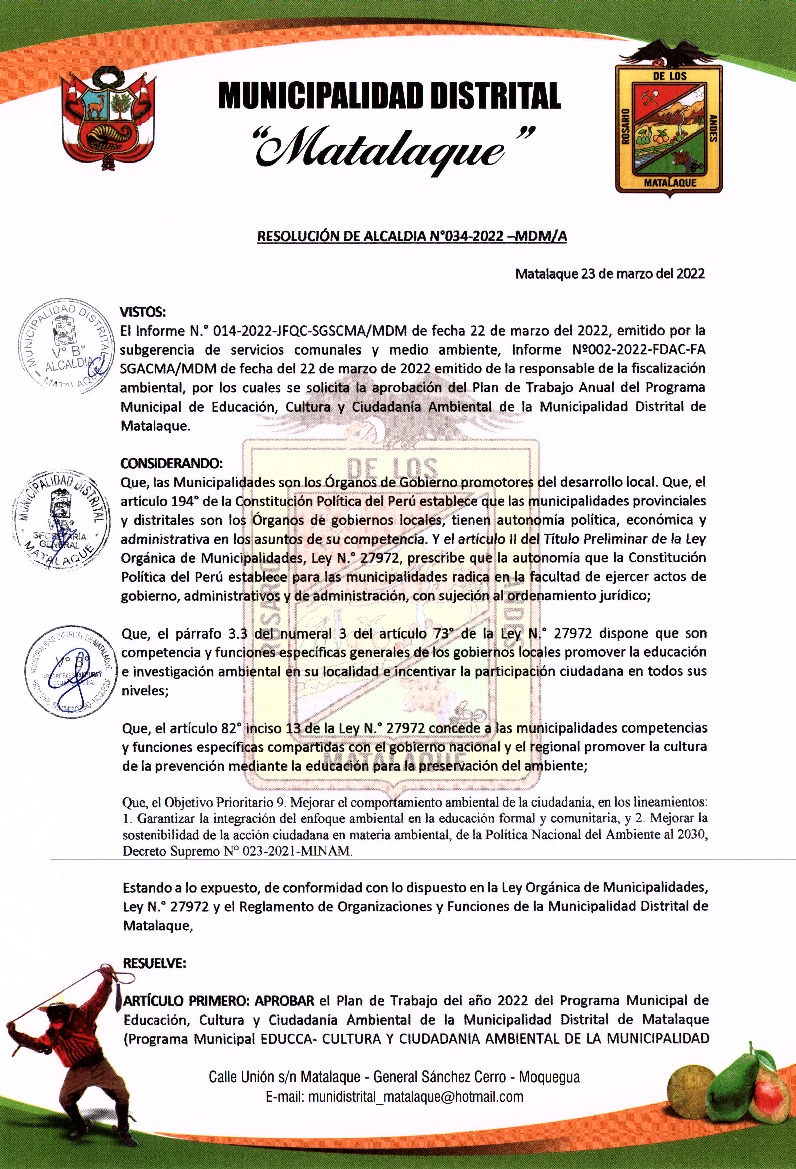 La presente Resolución aprueba el Plan de Trabajo 2022 del Programa Municipal de Educación, Cultura y Ciudadanía Ambiental de la Municipalidad Distrital de Matalaque - General Sánchez Cerro, con la finalidad de definir las actividades de educación, cultura y ciudadanía ambiental que se desarrollarán en la localidad durante el presente año.