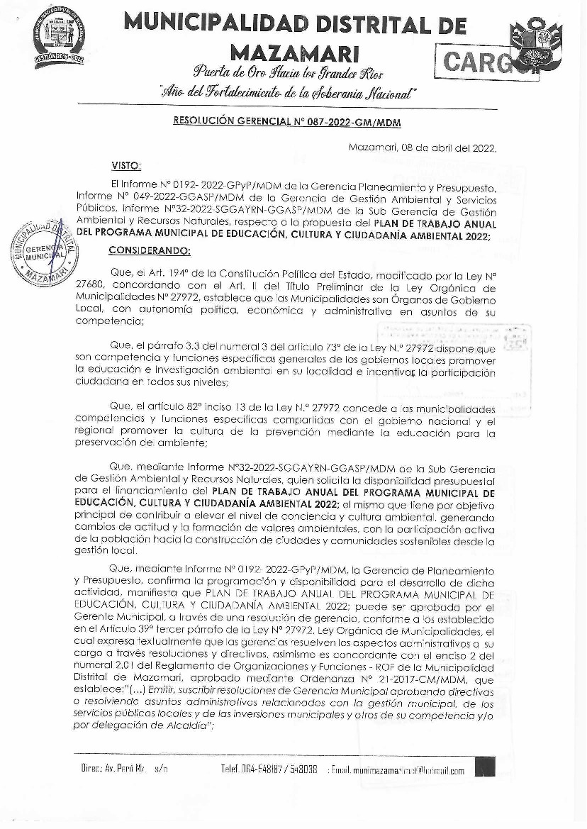 La presente Resolución aprueba el Plan de Trabajo 2022 del Programa Municipal de Educación, Cultura y Ciudadanía Ambiental de la Municipalidad Distrital de Mazamari, con la finalidad de definir las actividades de educación, cultura y ciudadanía ambiental que se desarrollarán en la localidad durante el presente año.