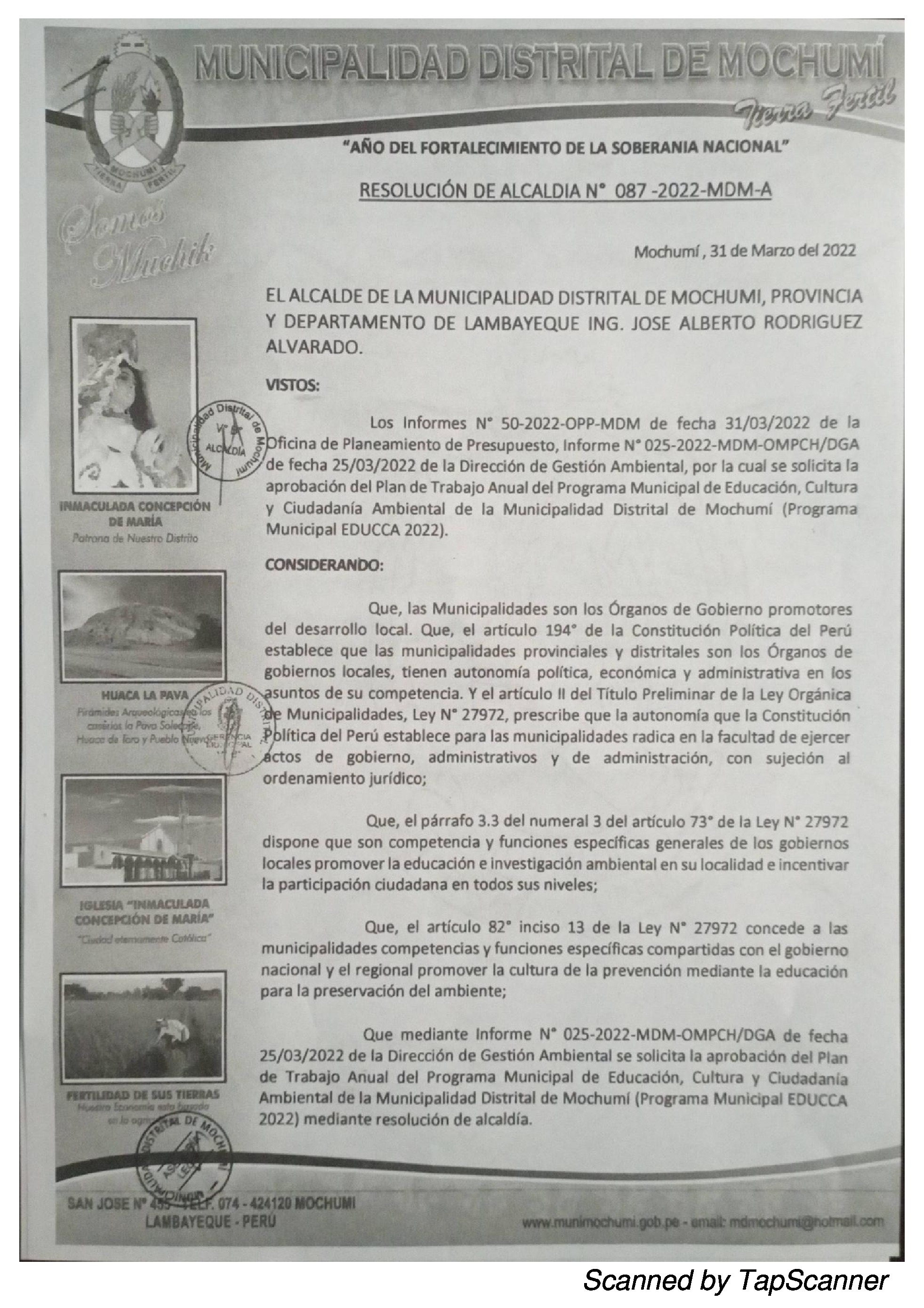 La presente Resolución aprueba el Plan de Trabajo 2022 del Programa Municipal de Educación, Cultura y Ciudadanía Ambiental de la Municipalidad Distrital de Mochumí, con la finalidad de definir las actividades de educación, cultura y ciudadanía ambiental que se desarrollarán en la localidad durante el presente año.