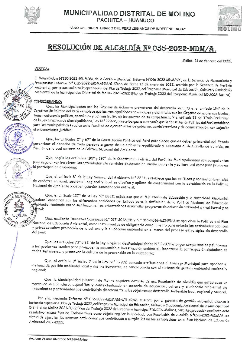 La presente Resolución aprueba el Plan de Trabajo 2022 del Programa Municipal de Educación, Cultura y Ciudadanía Ambiental de la Municipalidad Distrital de Molino, con la finalidad de definir las actividades de educación, cultura y ciudadanía ambiental que se desarrollarán en la localidad durante el presente año.