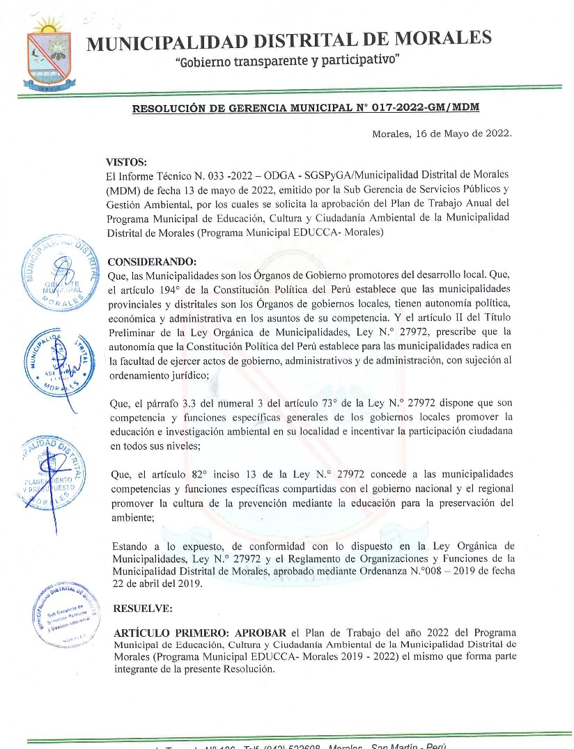 La presente Resolución aprueba el Plan de Trabajo 2022 del Programa Municipal de Educación, Cultura y Ciudadanía Ambiental de la Municipalidad Distrital de Morales, con la finalidad de definir las actividades de educación, cultura y ciudadanía ambiental que se desarrollarán en la localidad durante el presente año.