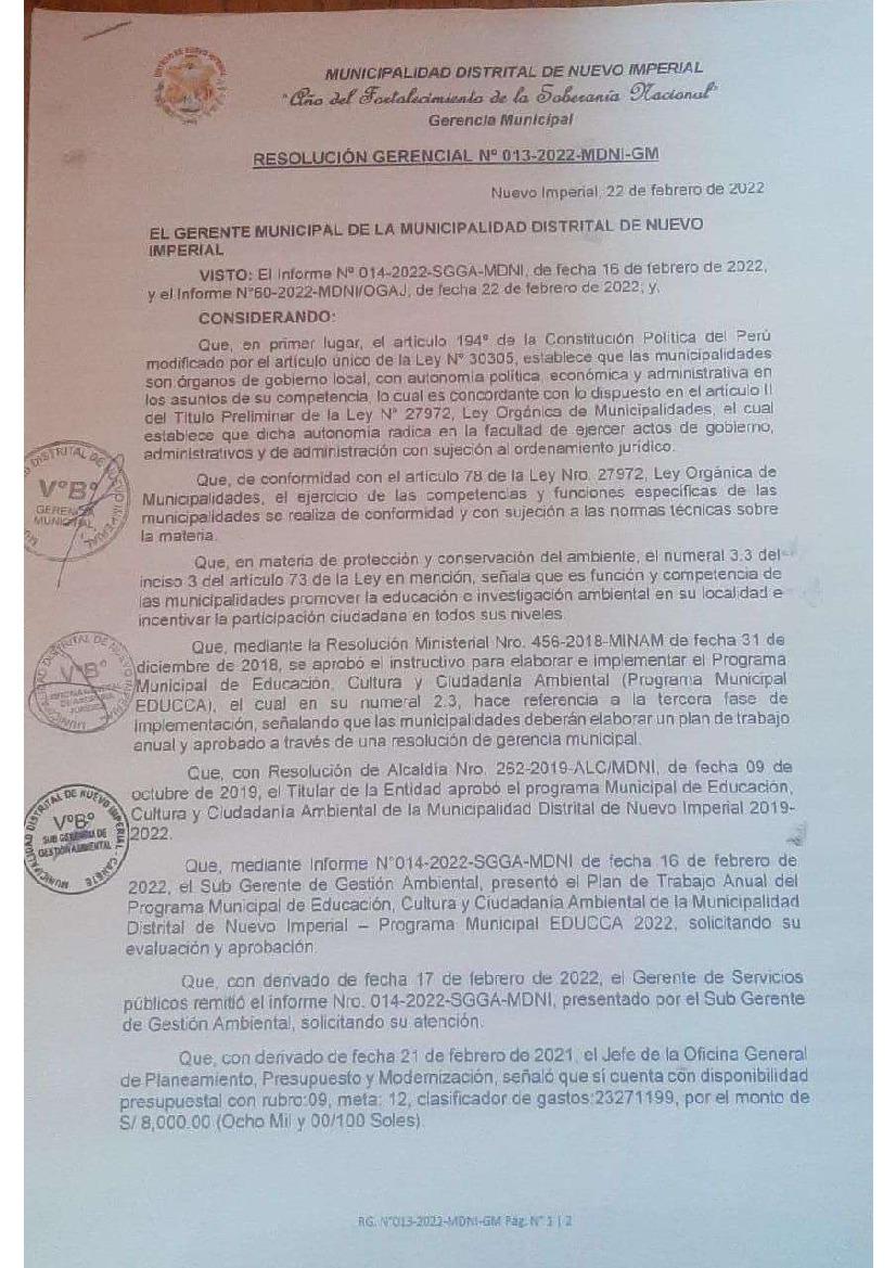 La presente Resolución aprueba el Plan de Trabajo 2022 del Programa Municipal de Educación, Cultura y Ciudadanía Ambiental de la Municipalidad Distrital de Nuevo Imperial- Cañete, con la finalidad de definir las actividades de educación, cultura y ciudadanía ambiental que se desarrollarán en la localidad durante el presente año.