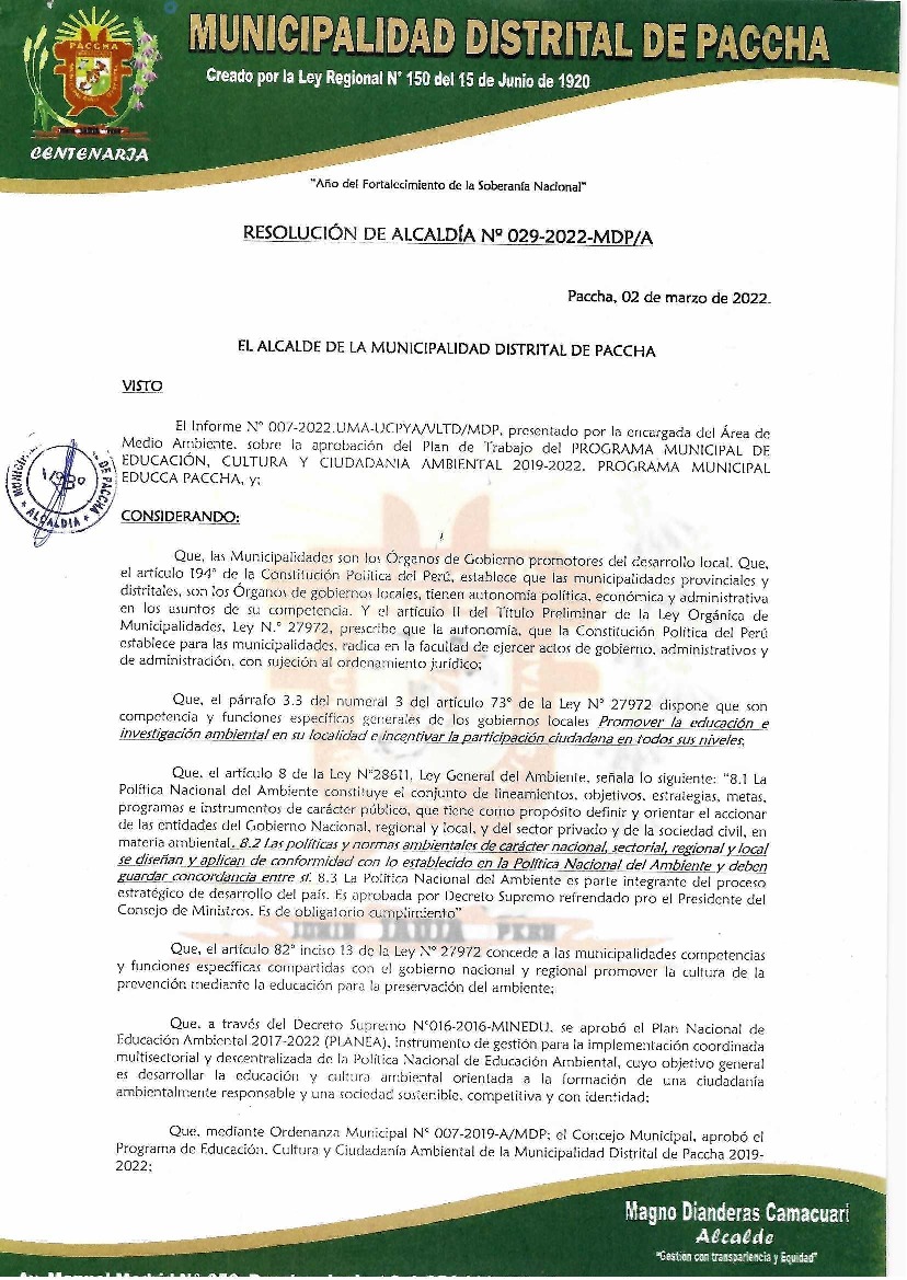 La presente Resolución aprueba el Plan de Trabajo 2022 del Programa Municipal de Educación, Cultura y Ciudadanía Ambiental de la Municipalidad Distrital de Paccha, con la finalidad de definir las actividades de educación, cultura y ciudadanía ambiental que se desarrollarán en la localidad durante el presente año.