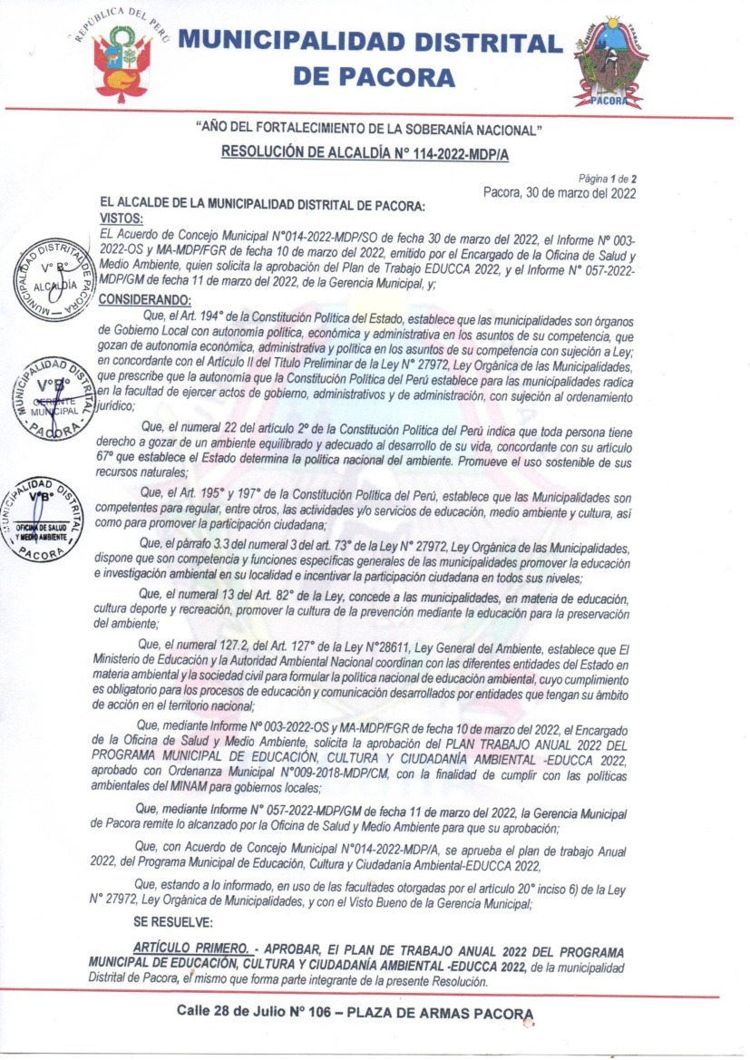 La presente Resolución aprueba el Plan de Trabajo 2022 del Programa Municipal de Educación, Cultura y Ciudadanía Ambiental de la Municipalidad Distrital de Pacora, con la finalidad de definir las actividades de educación, cultura y ciudadanía ambiental que se desarrollarán en la localidad durante el presente año.