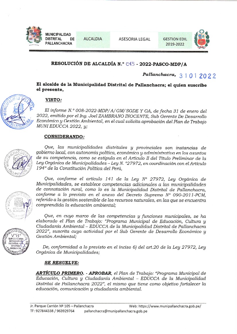 La presente Resolución aprueba el Plan de Trabajo 2022 del Programa Municipal de Educación, Cultura y Ciudadanía Ambiental de la Municipalidad Distrital de Pallanchacra, con la finalidad de definir las actividades de educación, cultura y ciudadanía ambiental que se desarrollarán en la localidad durante el presente año.