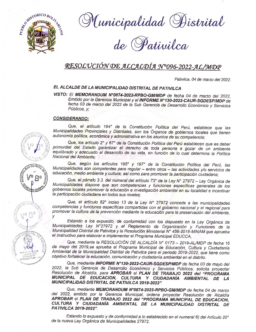La presente Resolución aprueba el Plan de Trabajo 2022 del Programa Municipal de Educación, Cultura y Ciudadanía Ambiental de la Municipalidad Distrital de Pativilca - Barranca, con la finalidad de definir las actividades de educación, cultura y ciudadanía ambiental que se desarrollarán en la localidad durante el presente año.