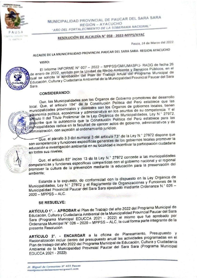 La presente Resolución aprueba el Plan de Trabajo 2022 del Programa Municipal de Educación, Cultura y Ciudadanía Ambiental de la Municipalidad Provincial de Paucar del Sara Sara, con la finalidad de definir las actividades de educación, cultura y ciudadanía ambiental que se desarrollarán en la localidad durante el presente año.