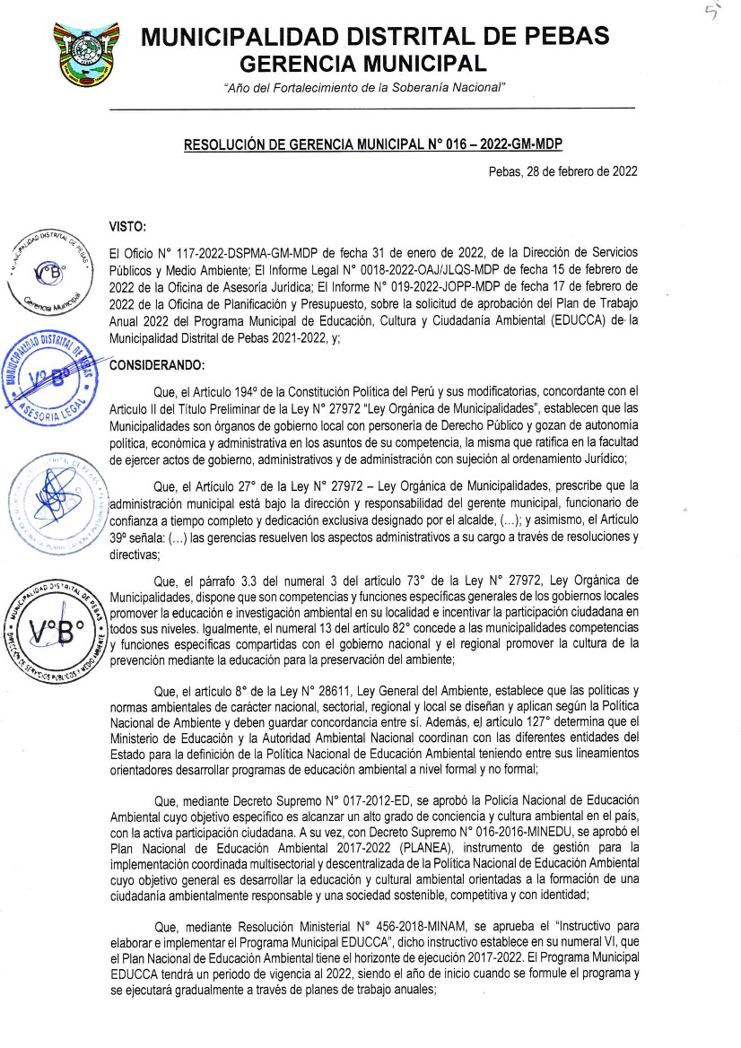La presente Resolución aprueba el Plan de Trabajo 2022 del Programa Municipal de Educación, Cultura y Ciudadanía Ambiental de la Municipalidad Distrital de Pebas, con la finalidad de definir las actividades de educación, cultura y ciudadanía ambiental que se desarrollarán en la localidad durante el presente año.