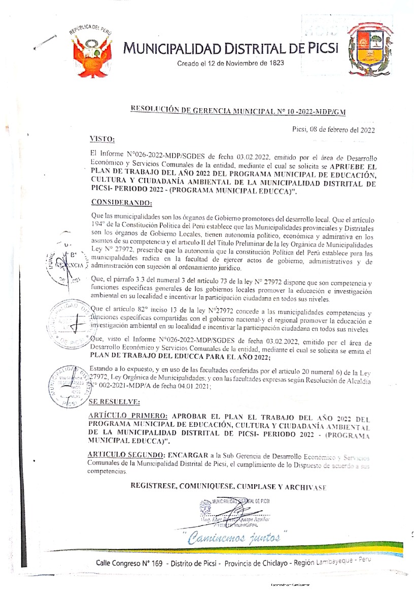 La presente Resolución aprueba el Plan de Trabajo 2022 del Programa Municipal de Educación, Cultura y Ciudadanía Ambiental de la Municipalidad Distrital de Picsi, con la finalidad de definir las actividades de educación, cultura y ciudadanía ambiental que se desarrollarán en la localidad durante el presente año.