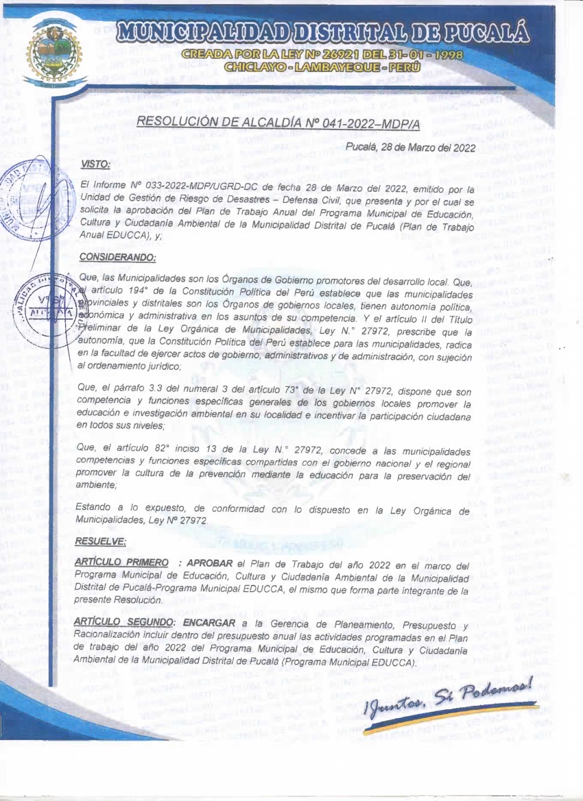 La presente Resolución aprueba el Plan de Trabajo 2022 del Programa Municipal de Educación, Cultura y Ciudadanía Ambiental de la Municipalidad Distrital de Pucalá, con la finalidad de definir las actividades de educación, cultura y ciudadanía ambiental que se desarrollarán en la localidad durante el presente año.