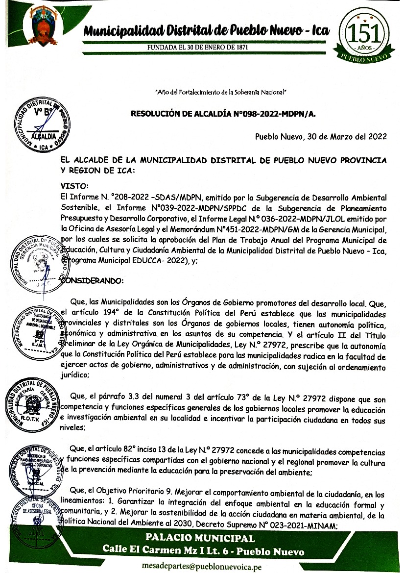 La presente Resolución aprueba el Plan de Trabajo 2022 del Programa Municipal de Educación, Cultura y Ciudadanía Ambiental de la Municipalidad Distrital de Pueblo Nuevo - Ica - Ica, con la finalidad de definir las actividades de educación, cultura y ciudadanía ambiental que se desarrollarán en la localidad durante el presente año.