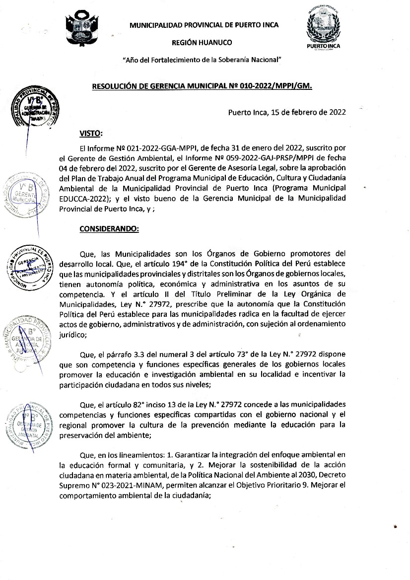 La presente Resolución aprueba el Plan de Trabajo 2022 del Programa Municipal de Educación, Cultura y Ciudadanía Ambiental de la Municipalidad Provincia de Puerto Inca, con la finalidad de definir las actividades de educación, cultura y ciudadanía ambiental que se desarrollarán en la localidad durante el presente año.