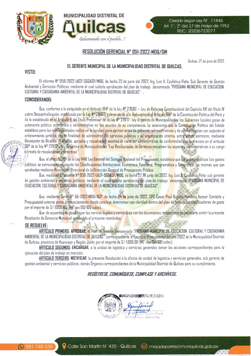 La presente Resolución aprueba el Plan de Trabajo 2022 del Programa Municipal de Educación, Cultura y Ciudadanía Ambiental de la Municipalidad Distrital de Quilcas, con la finalidad de definir las actividades de educación, cultura y ciudadanía ambiental que se desarrollarán en la localidad durante el presente año.