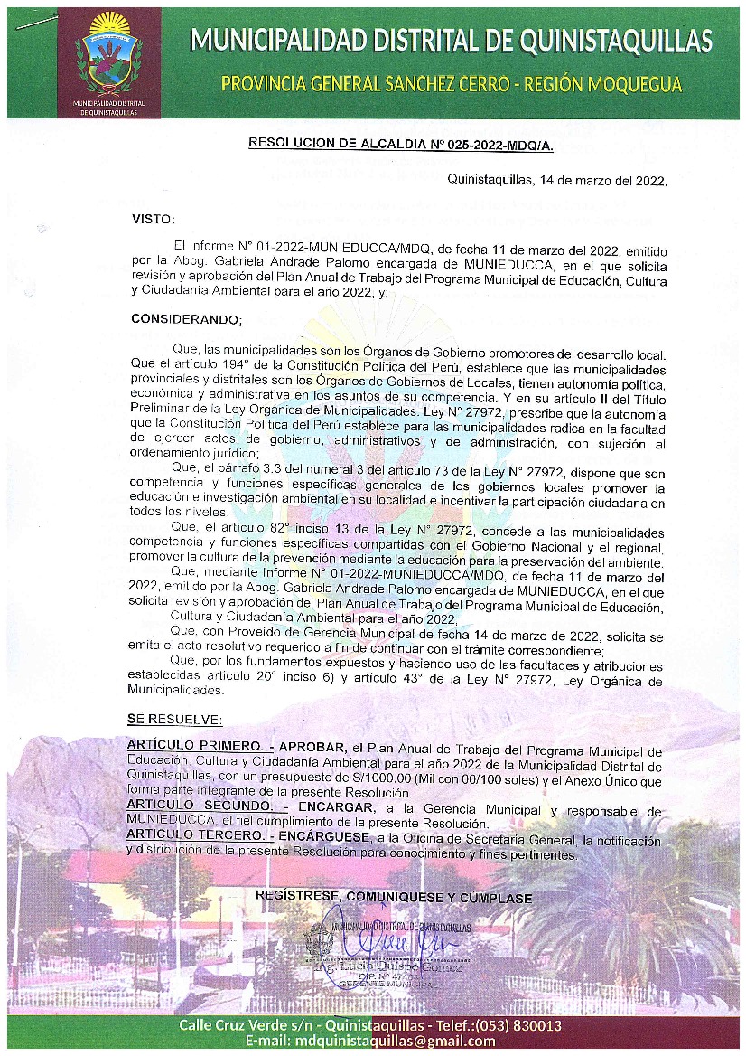La presente Resolución aprueba el Plan de Trabajo 2022 del Programa Municipal de Educación, Cultura y Ciudadanía Ambiental de la Municipalidad Distrital de Quinistaquillas, con la finalidad de definir las actividades de educación, cultura y ciudadanía ambiental que se desarrollarán en la localidad durante el presente año.