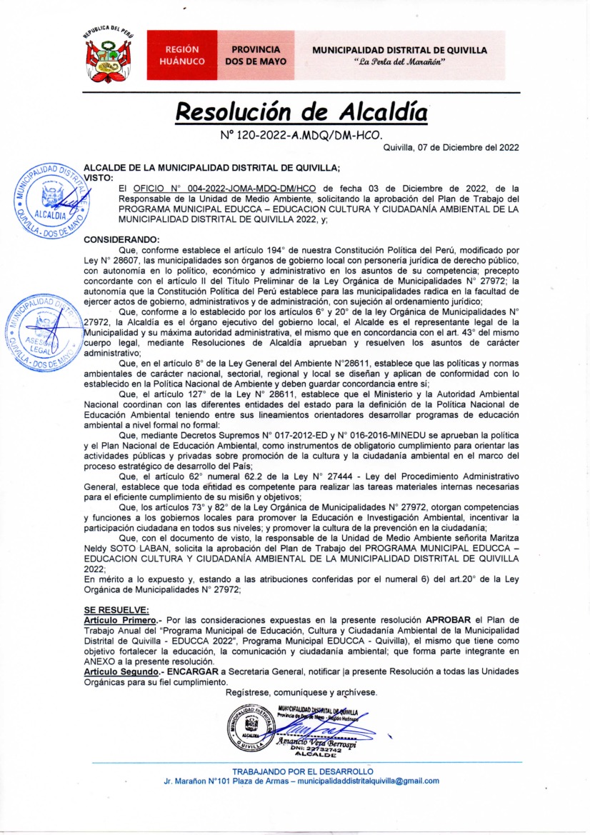 La presente Resolución aprueba el Plan de Trabajo 2022 del Programa Municipal de Educación, Cultura y Ciudadanía Ambiental de la Municipalidad Distrital de Quivilla, con la finalidad de definir las actividades de educación, cultura y ciudadanía ambiental que se desarrollarán en la localidad durante el presente año.