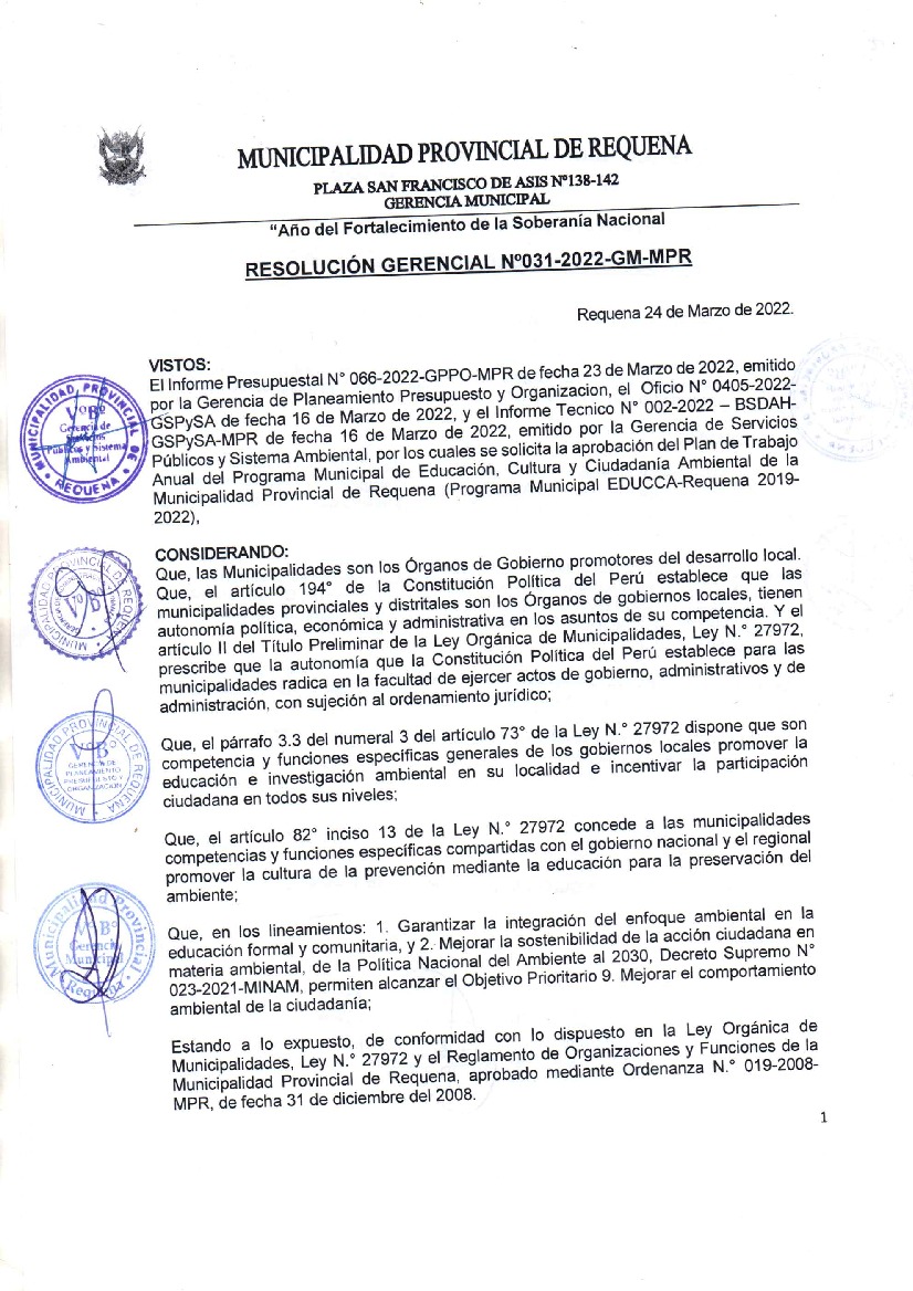 La presente Resolución aprueba el Plan de Trabajo 2022 del Programa Municipal de Educación, Cultura y Ciudadanía Ambiental de la Municipalidad Provincia de Requena, con la finalidad de definir las actividades de educación, cultura y ciudadanía ambiental que se desarrollarán en la localidad durante el presente año.