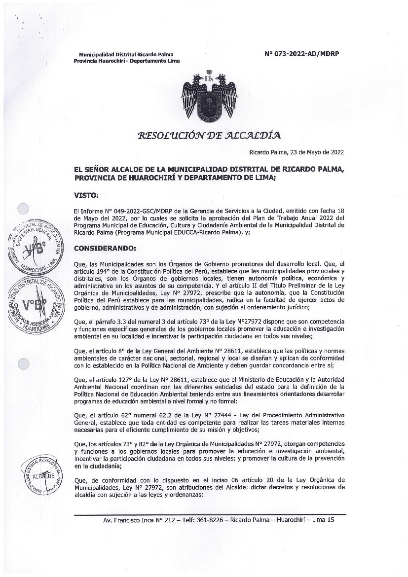 La presente Resolución aprueba el Plan de Trabajo 2022 del Programa Municipal de Educación, Cultura y Ciudadanía Ambiental de la Municipalidad Distrital de Ricardo Palma, Huarochirí, con la finalidad de definir las actividades de educación, cultura y ciudadanía ambiental que se desarrollarán en la localidad durante el presente año.