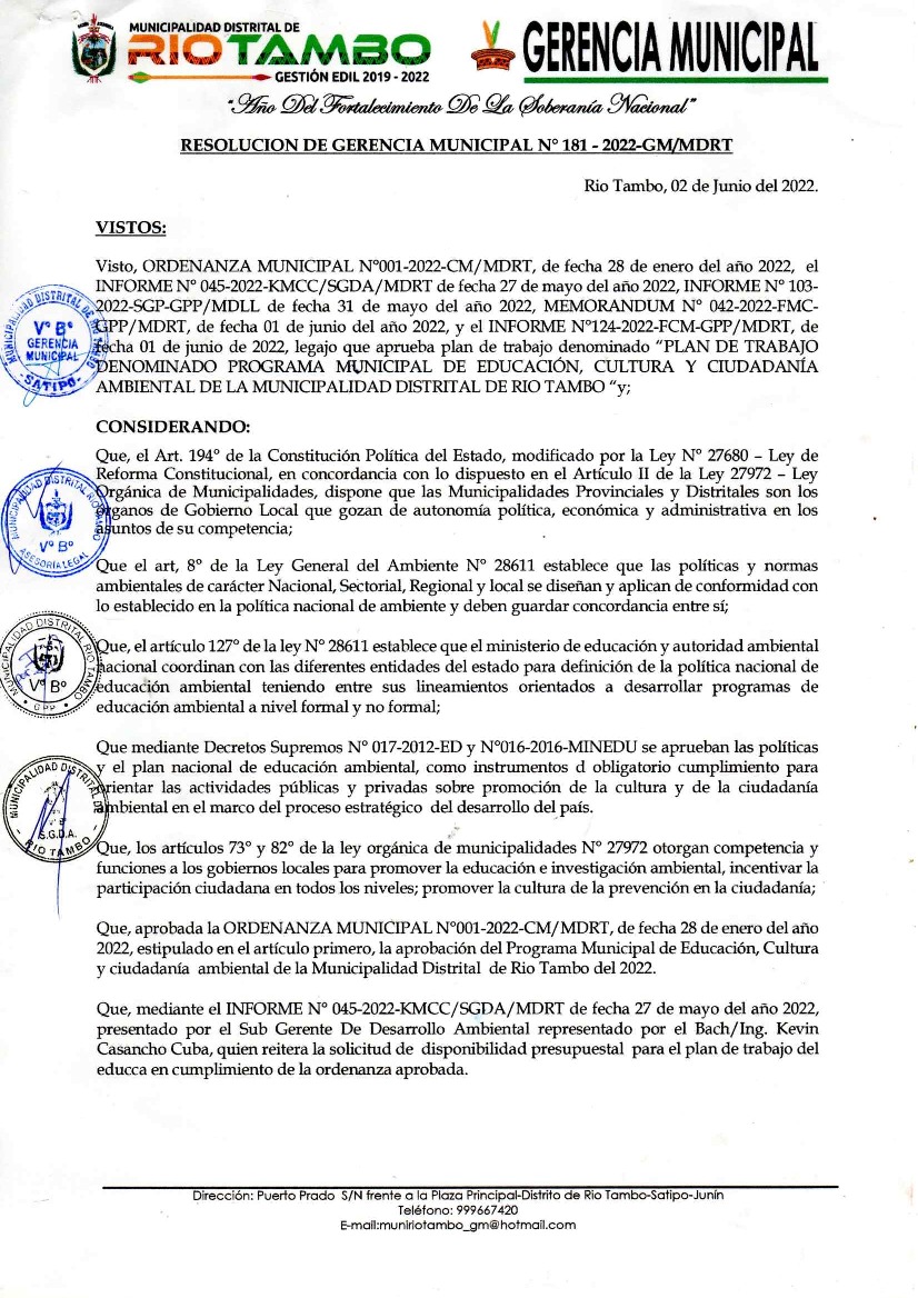 La presente Resolución aprueba el Plan de Trabajo 2022 del Programa Municipal de Educación, Cultura y Ciudadanía Ambiental de la Municipalidad Distrital de Rio Tambo, con la finalidad de definir las actividades de educación, cultura y ciudadanía ambiental que se desarrollarán en la localidad durante el presente año.