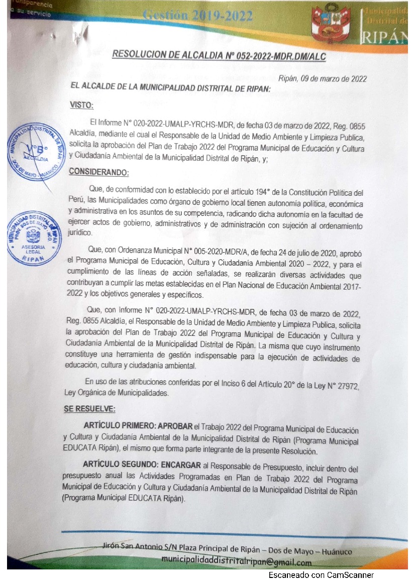 La presente Resolución aprueba el Plan de Trabajo 2022 del Programa Municipal de Educación, Cultura y Ciudadanía Ambiental de la Municipalidad Distrital de Ripán, con la finalidad de definir las actividades de educación, cultura y ciudadanía ambiental que se desarrollarán en la localidad durante el presente año.