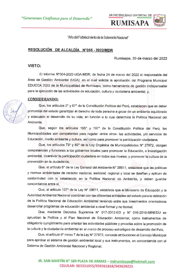 La presente Resolución aprueba el Plan de Trabajo 2022 del Programa Municipal de Educación, Cultura y Ciudadanía Ambiental de la Municipalidad Distrital de Rumisapa, con la finalidad de definir las actividades de educación, cultura y ciudadanía ambiental que se desarrollarán en la localidad durante el presente año.