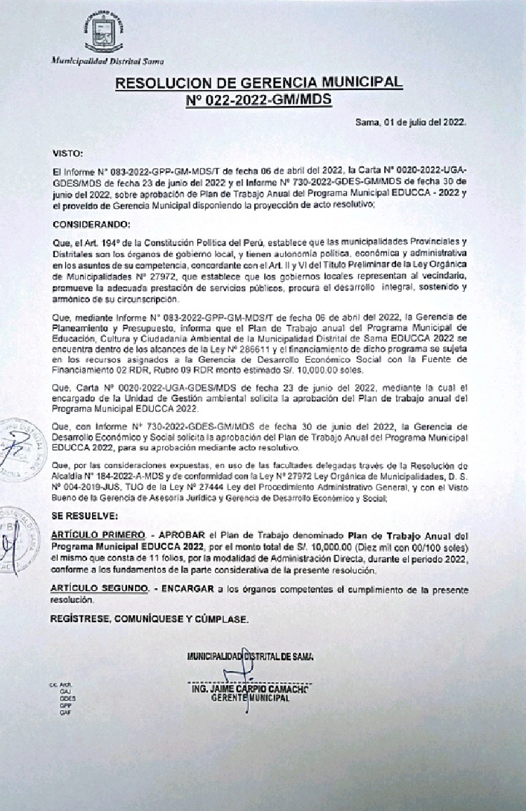 Plan de Trabajo 2022 del Programa Municipal EDUCCA - Sama