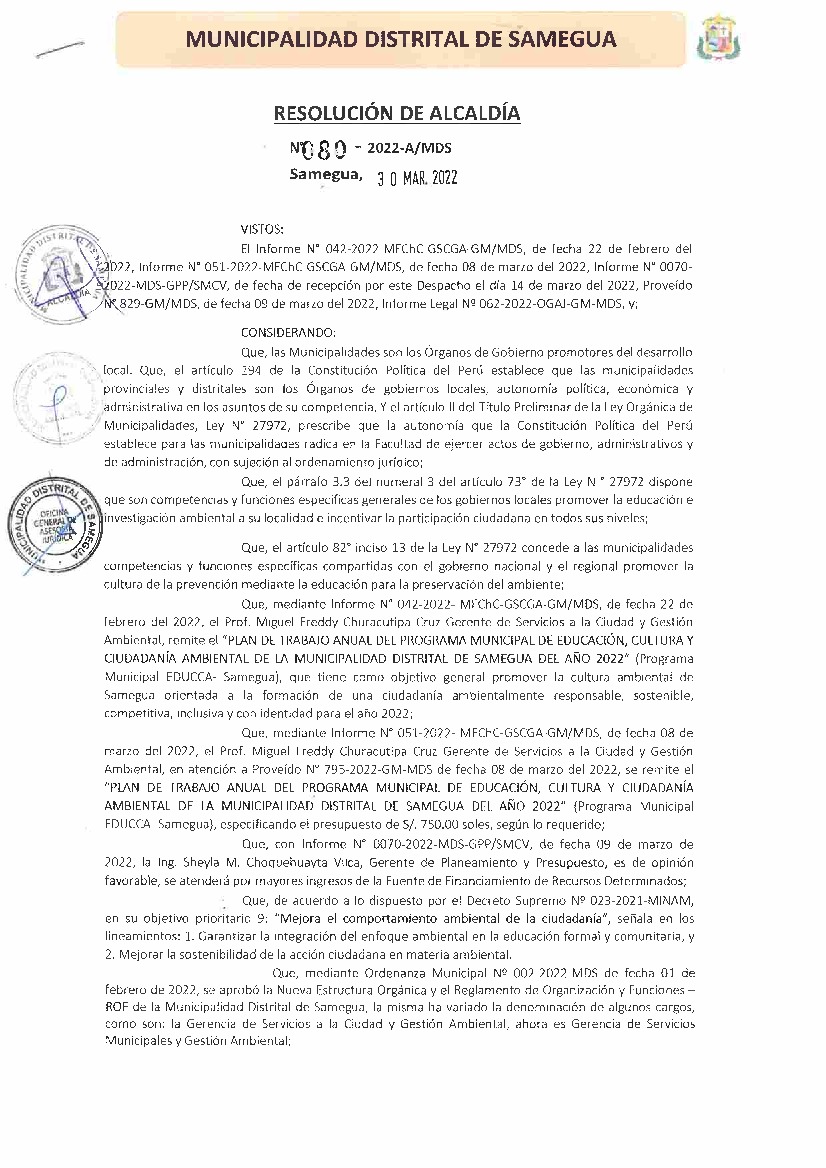 La presente Resolución aprueba el Plan de Trabajo 2022 del Programa Municipal de Educación, Cultura y Ciudadanía Ambiental de la Municipalidad Distrital de Samegua - Mariscal Nieto, con la finalidad de definir las actividades de educación, cultura y ciudadanía ambiental que se desarrollarán en la localidad durante el presente año.