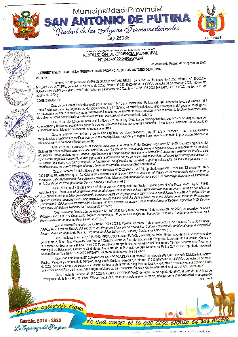 La presente Resolución aprueba el Plan de Trabajo 2022 del Programa Municipal de Educación, Cultura y Ciudadanía Ambiental de la Municipalidad Provincial de San Antonio de Putina, con la finalidad de definir las actividades de educación, cultura y ciudadanía ambiental que se desarrollarán en la localidad durante el presente año.