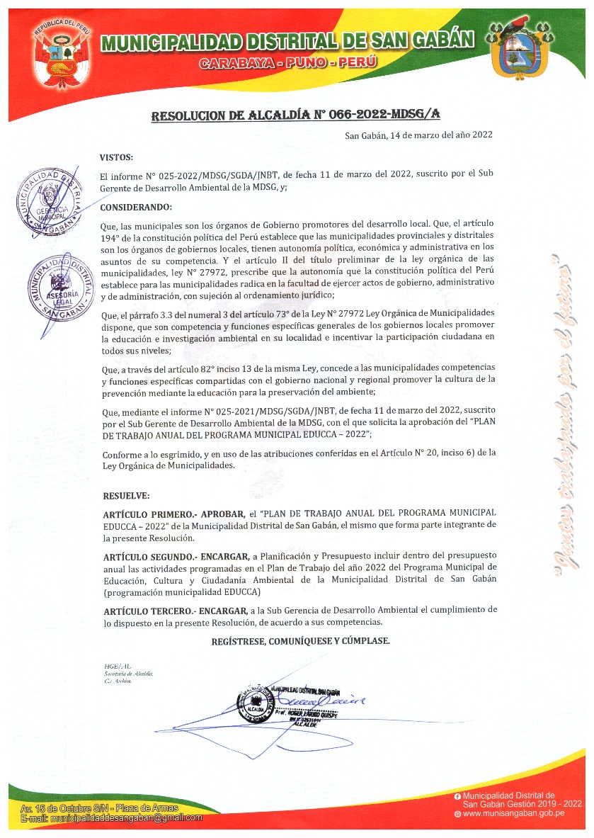 La presente Resolución aprueba el Plan de Trabajo 2022 del Programa Municipal de Educación, Cultura y Ciudadanía Ambiental de la Municipalidad Distrital de San Gabán, con la finalidad de definir las actividades de educación, cultura y ciudadanía ambiental que se desarrollarán en la localidad durante el presente año.