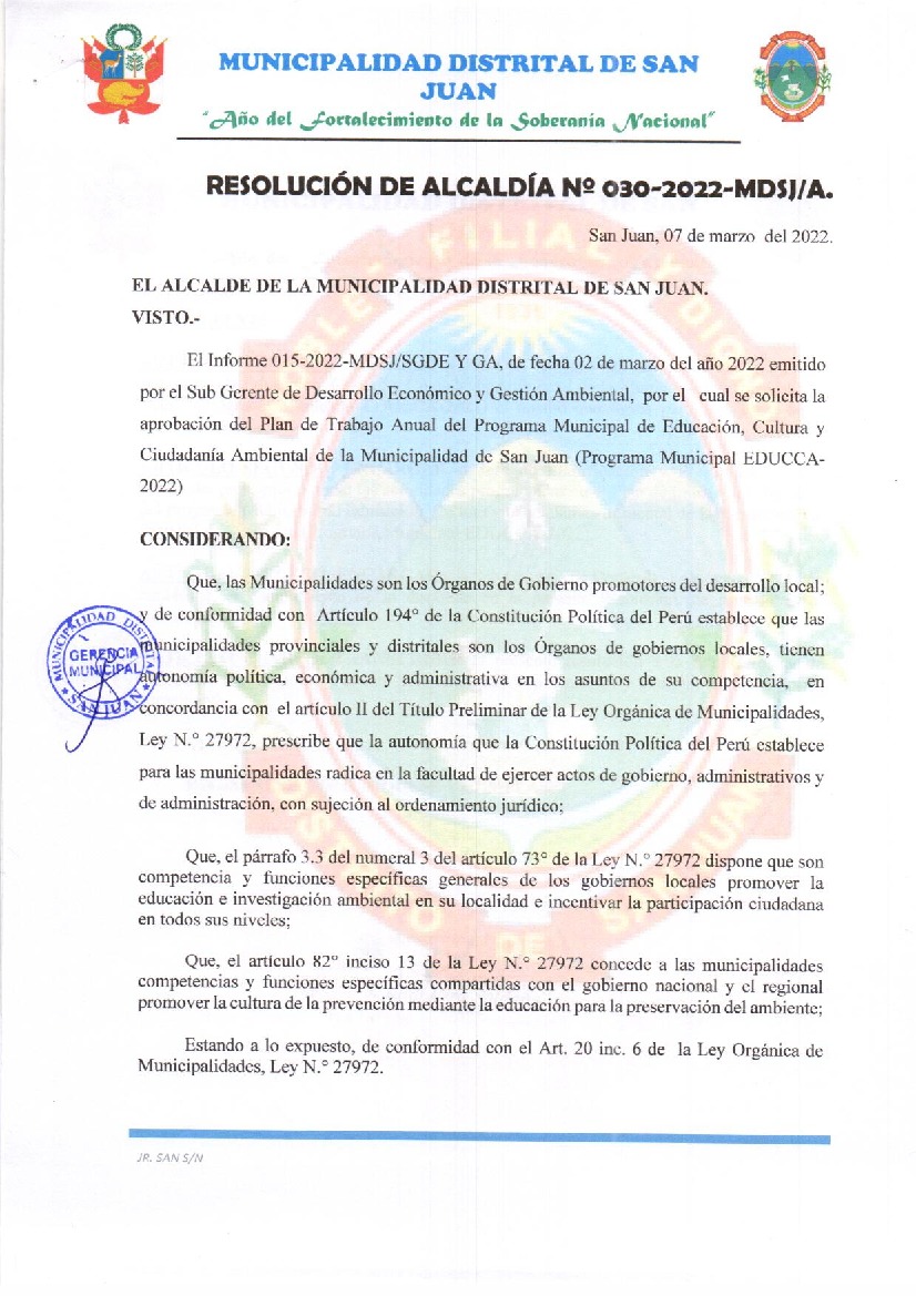 La presente Resolución aprueba el Plan de Trabajo 2022 del Programa Municipal de Educación, Cultura y Ciudadanía Ambiental de la Municipalidad Distrital de San Juan, Cajamarca (Cajamarca) con la finalidad de definir las actividades de educación, cultura y ciudadanía ambiental que se desarrollarán en la localidad durante el presente año.