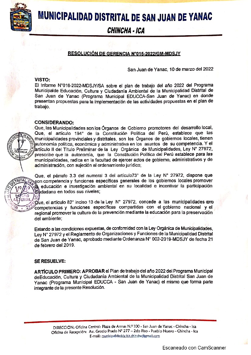 La presente Resolución aprueba el Plan de Trabajo 2022 del Programa Municipal de Educación, Cultura y Ciudadanía Ambiental de la Municipalidad Distrital de San Juan de Yanac - Chincha, con la finalidad de definir las actividades de educación, cultura y ciudadanía ambiental que se desarrollarán en la localidad durante el presente año.