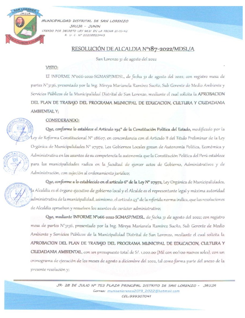 La presente Resolución aprueba el Plan de Trabajo 2022 del Programa Municipal de Educación, Cultura y Ciudadanía Ambiental de la Municipalidad Distrital de San Lorenzo, con la finalidad de definir las actividades de educación, cultura y ciudadanía ambiental que se desarrollarán en la localidad durante el presente año.