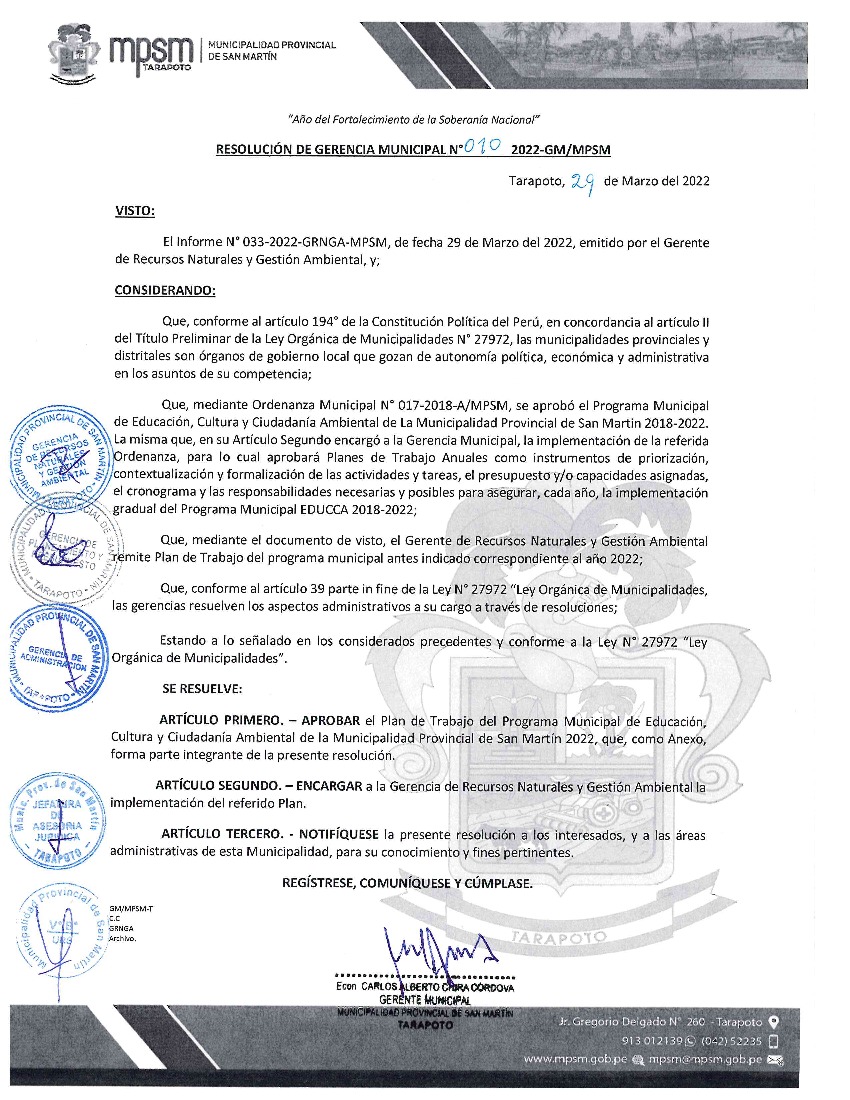 La presente Resolución aprueba el Plan de Trabajo 2022 del Programa Municipal de Educación, Cultura y Ciudadanía Ambiental de la Municipalidad Provincia de San Martín, con la finalidad de definir las actividades de educación, cultura y ciudadanía ambiental que se desarrollarán en la localidad durante el presente año.