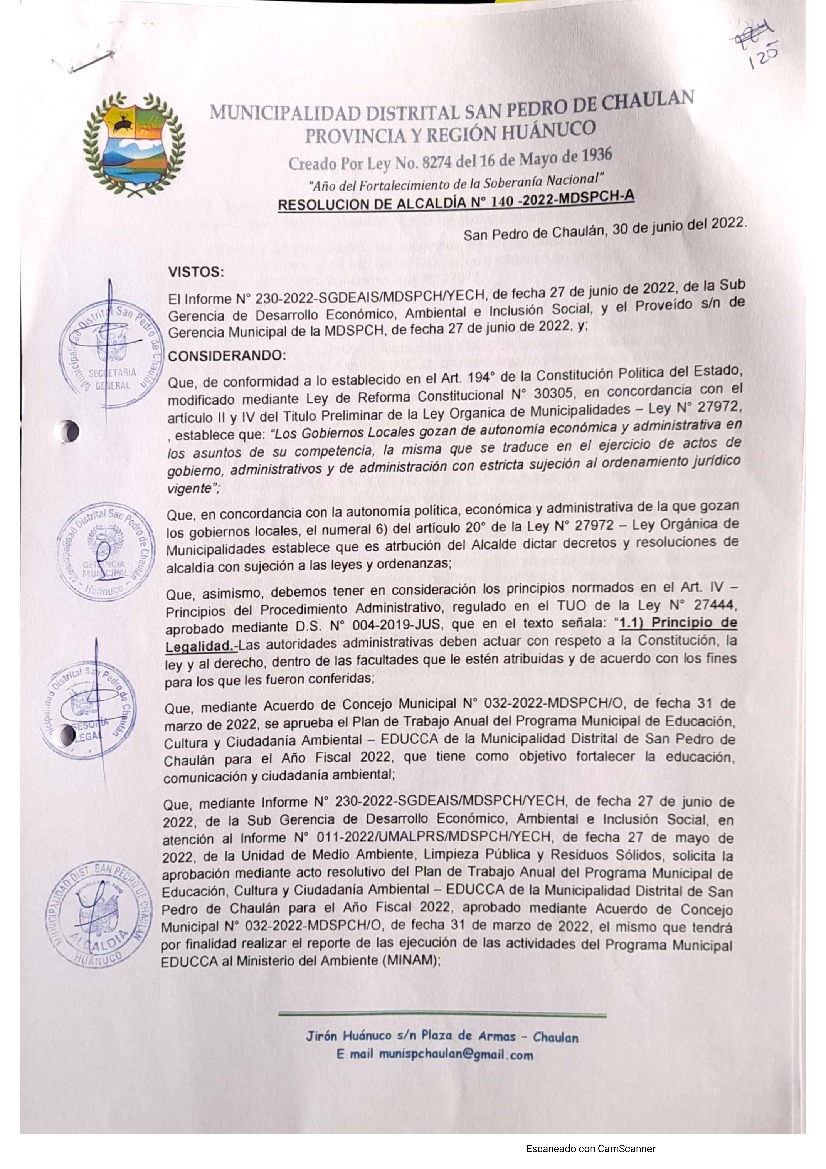 La presente Resolución aprueba el Plan de Trabajo 2022 del Programa Municipal de Educación, Cultura y Ciudadanía Ambiental de la Municipalidad Distrital de San Pedro de Chaulán, con la finalidad de definir las actividades de educación, cultura y ciudadanía ambiental que se desarrollarán en la localidad durante el presente año.