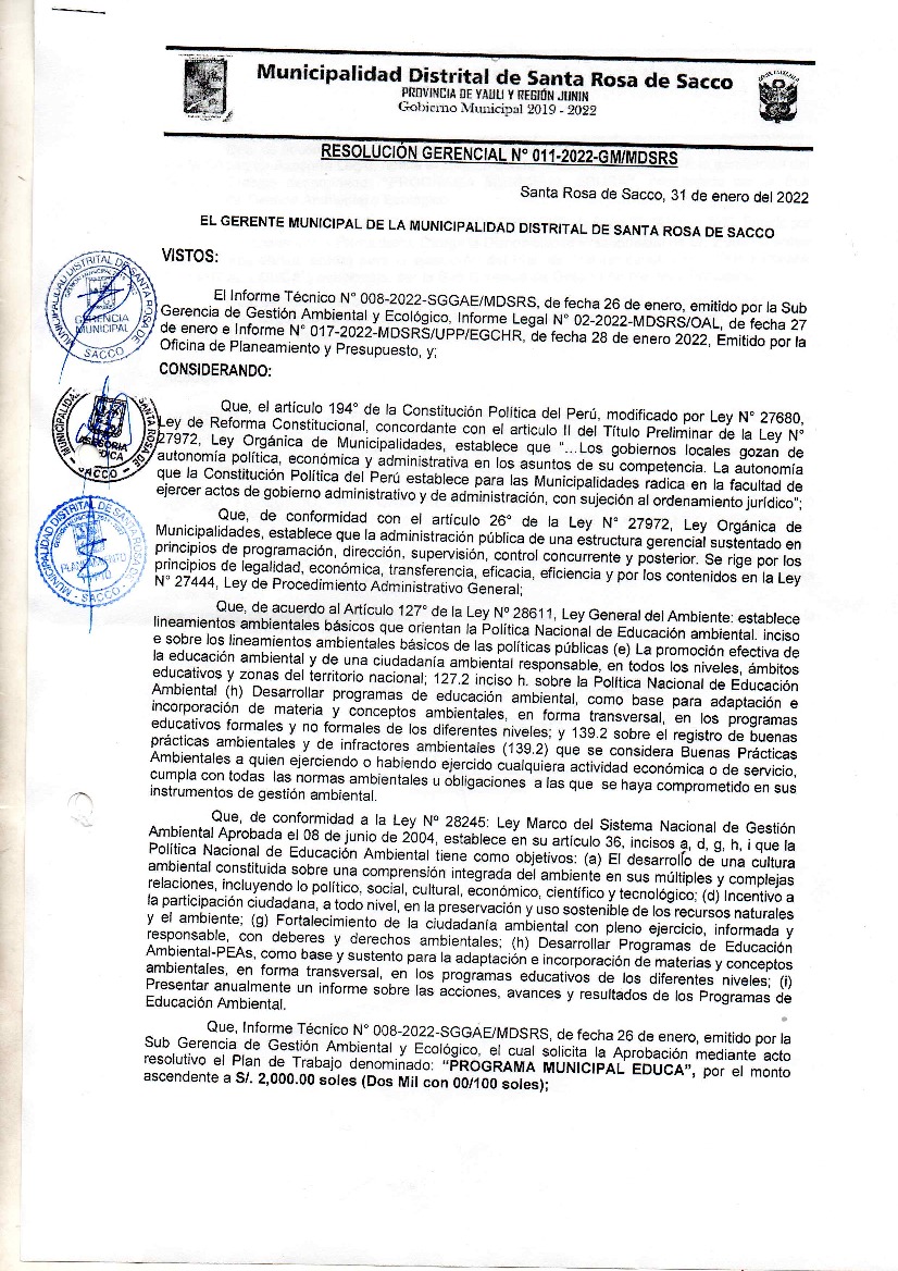 La presente Resolución aprueba el Plan de Trabajo 2022 del Programa Municipal de Educación, Cultura y Ciudadanía Ambiental de la Municipalidad Distrital de Santa Rosa de Sacco, con la finalidad de definir las actividades de educación, cultura y ciudadanía ambiental que se desarrollarán en la localidad durante el presente año.