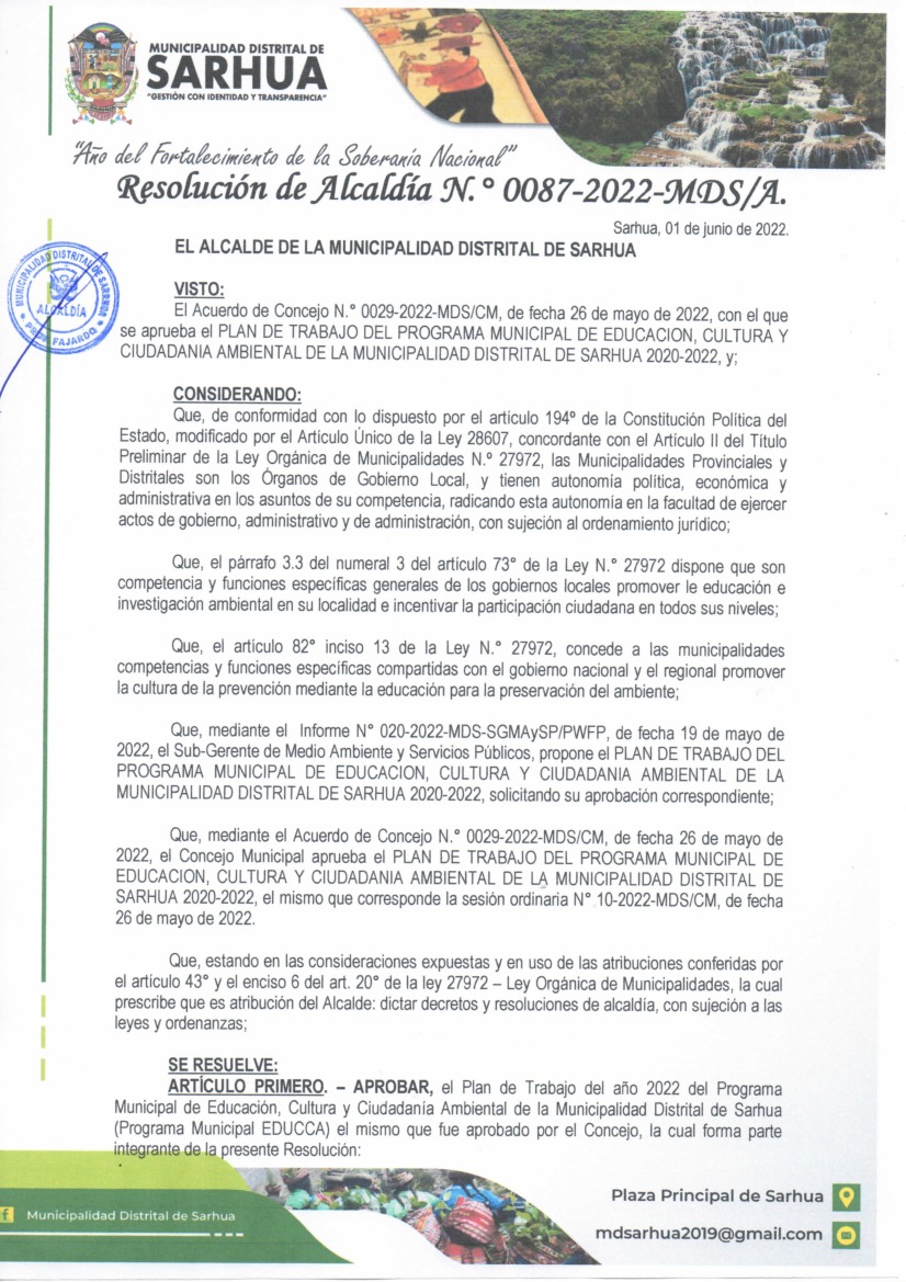 La presente Resolución aprueba el Plan de Trabajo 2022 del Programa Municipal de Educación, Cultura y Ciudadanía Ambiental de la Municipalidad Distrital de Sarhua, con la finalidad de definir las actividades de educación, cultura y ciudadanía ambiental que se desarrollarán en la localidad durante el presente año.