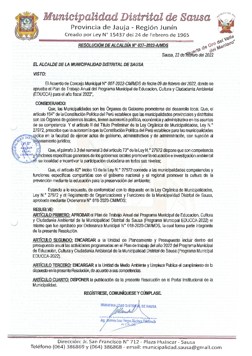 La presente Resolución aprueba el Plan de Trabajo 2022 del Programa Municipal de Educación, Cultura y Ciudadanía Ambiental de la Municipalidad Distrital de Sausa, con la finalidad de definir las actividades de educación, cultura y ciudadanía ambiental que se desarrollarán en la localidad durante el presente año.