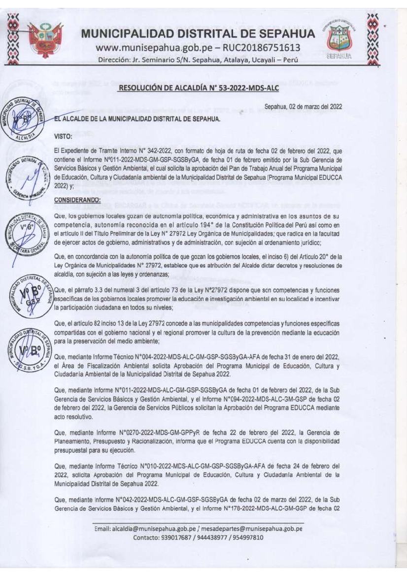 La presente Resolución aprueba el Plan de Trabajo 2022 del Programa Municipal de Educación, Cultura y Ciudadanía Ambiental de la Municipalidad Distrital de Sepahua, con la finalidad de definir las actividades de educación, cultura y ciudadanía ambiental que se desarrollarán en la localidad durante el presente año.
