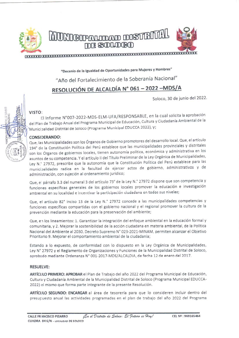 La presente Resolución aprueba el Plan de Trabajo 2022 del Programa Municipal de Educación, Cultura y Ciudadanía Ambiental de la Municipalidad Distrital de Soloco - Chachapoyas (Amazonas), con la finalidad de definir las actividades de educación, cultura y ciudadanía ambiental que se desarrollarán en la localidad durante el presente año