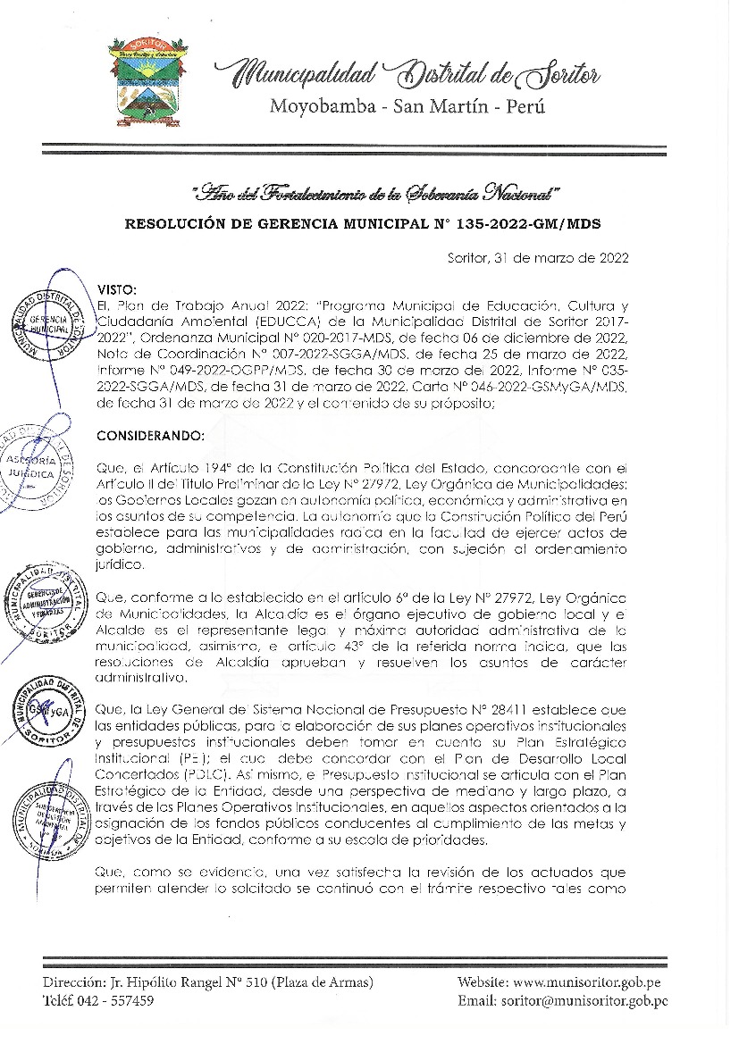La presente Resolución aprueba el Plan de Trabajo 2022 del Programa Municipal de Educación, Cultura y Ciudadanía Ambiental de la Municipalidad Distrital de Soritor, con la finalidad de definir las actividades de educación, cultura y ciudadanía ambiental que se desarrollarán en la localidad durante el presente año.