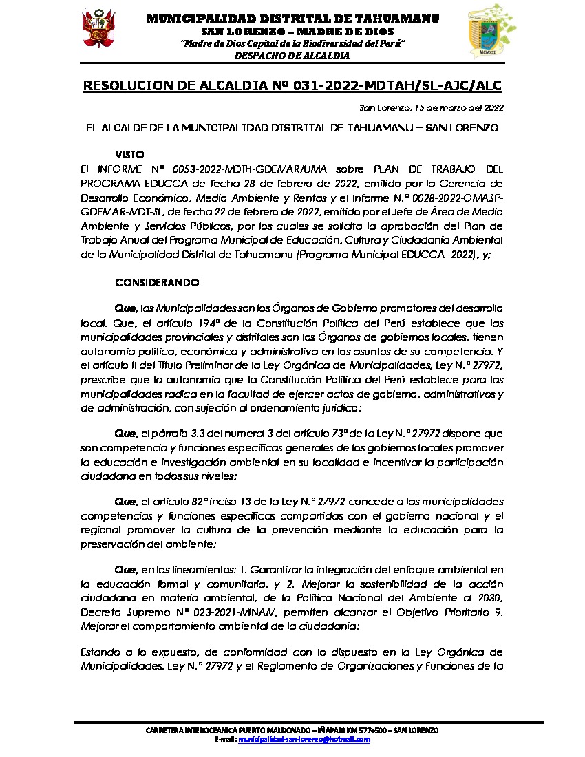 La presente Resolución aprueba el Plan de Trabajo 2022 del Programa Municipal de Educación, Cultura y Ciudadanía Ambiental de la Municipalidad Distrital de Tahuamanu, con la finalidad de definir las actividades de educación, cultura y ciudadanía ambiental que se desarrollarán en la localidad durante el presente año.
