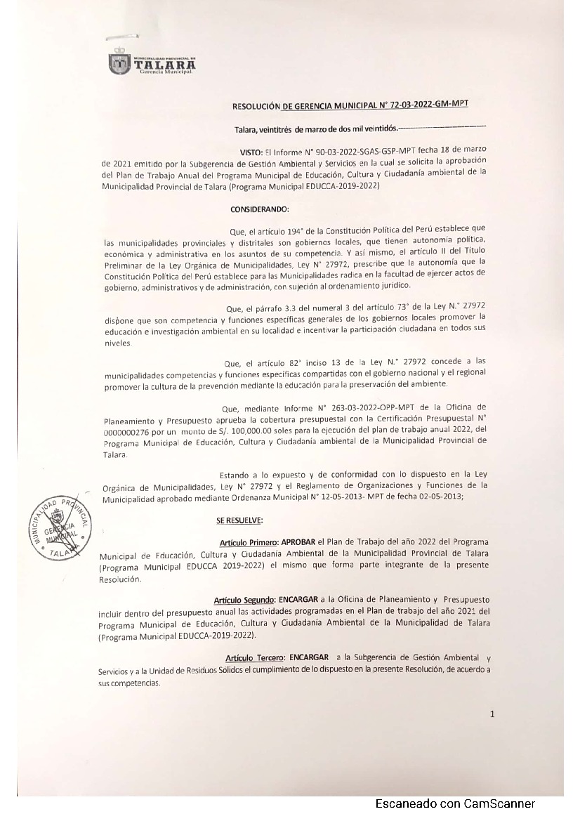 La presente Resolución aprueba el Plan de Trabajo 2022 del Programa Municipal de Educación, Cultura y Ciudadanía Ambiental de la Municipalidad Provincia de Talara, con la finalidad de definir las actividades de educación, cultura y ciudadanía ambiental que se desarrollarán en la localidad durante el presente año.