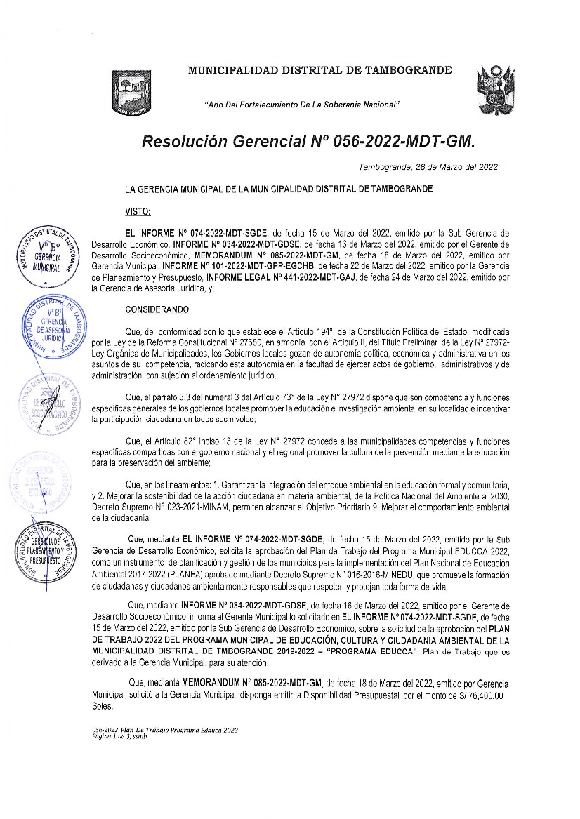 La presente Resolución aprueba el Plan de Trabajo 2022 del Programa Municipal de Educación, Cultura y Ciudadanía Ambiental de la Municipalidad Distrital de Tambogrande, con la finalidad de definir las actividades de educación, cultura y ciudadanía ambiental que se desarrollarán en la localidad durante el presente año.