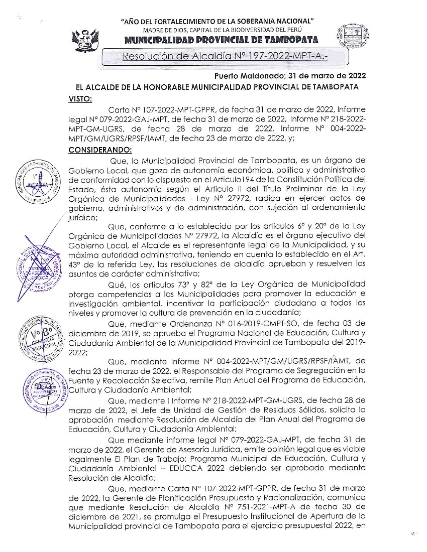 La presente Resolución aprueba el Plan de Trabajo 2022 del Programa Municipal de Educación, Cultura y Ciudadanía Ambiental de la Municipalidad Provincia de Tambopata, con la finalidad de definir las actividades de educación, cultura y ciudadanía ambiental que se desarrollarán en la localidad durante el presente año.