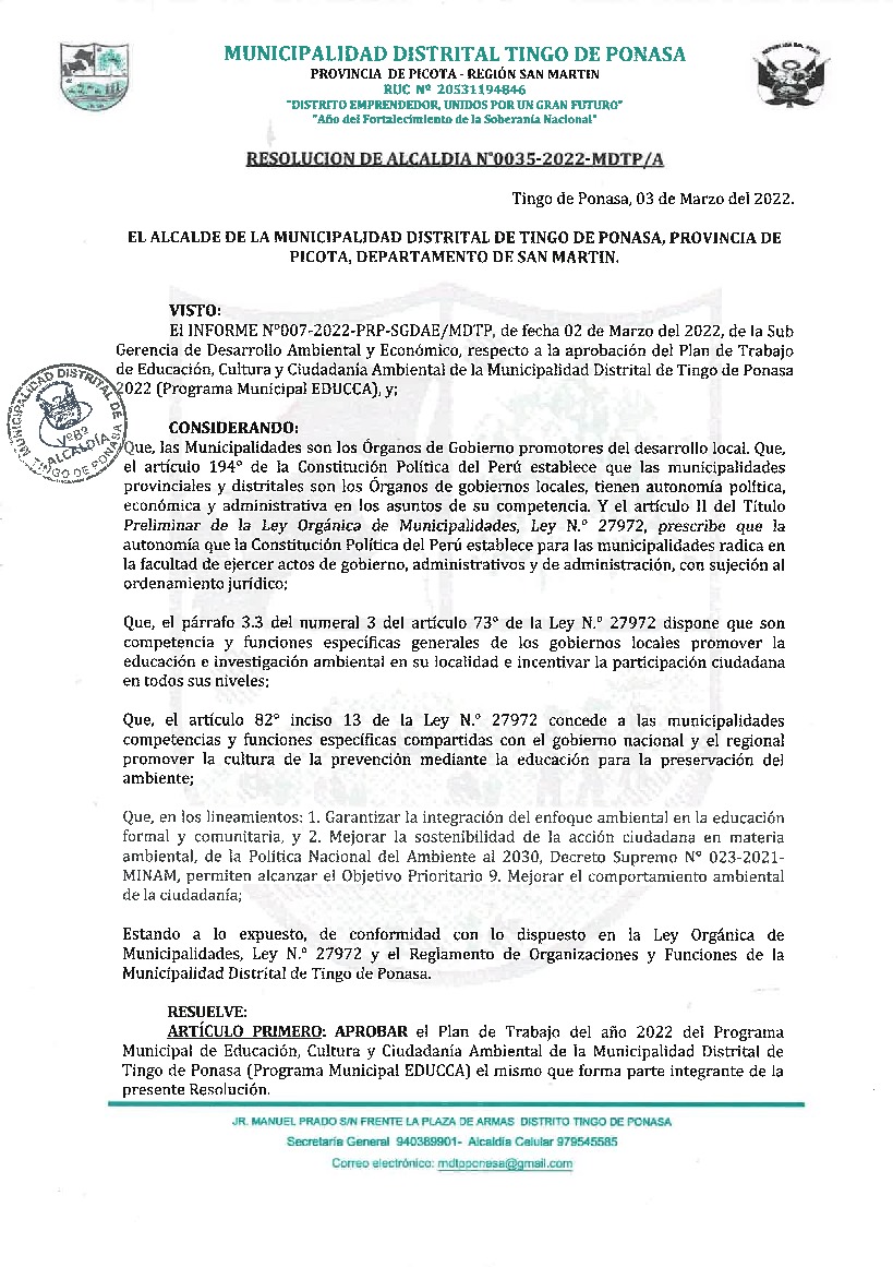 La presente Resolución aprueba el Plan de Trabajo 2022 del Programa Municipal de Educación, Cultura y Ciudadanía Ambiental de la Municipalidad Distrital de Tingo de Ponasa, con la finalidad de definir las actividades de educación, cultura y ciudadanía ambiental que se desarrollarán en la localidad durante el presente año.