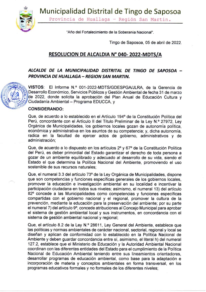 La presente Resolución aprueba el Plan de Trabajo 2022 del Programa Municipal de Educación, Cultura y Ciudadanía Ambiental de la Municipalidad Distrital de Tingo de Saposoa, con la finalidad de definir las actividades de educación, cultura y ciudadanía ambiental que se desarrollarán en la localidad durante el presente año.